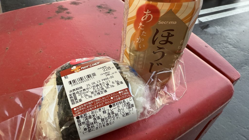 適当なセイコーマートで朝食。それなりに涼しいのであたたかいほうじ茶がありがたい。すじこのおにぎりは残念ながら置いてありませんでした。